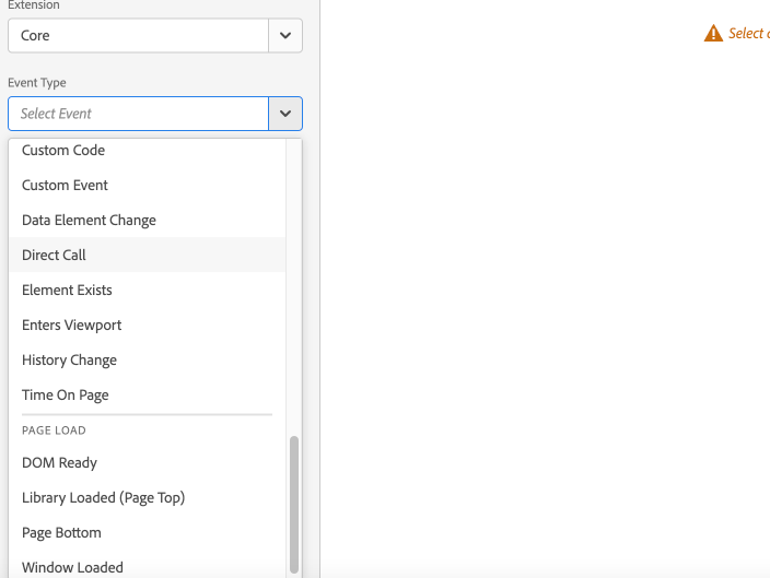 Direct Call Rules (DCR) event type is similar to the Custom Event type. This event type was initially in its own category in Adobe DTM. But has now rightly been placed in the Event Type menu. Direct Call Rule is a brute force way of firing an Adobe Launch rule when a developer wants it to. All you need to do is ask the developer to call a _satellite.track() method with the string name in the brackets. Adobe Launch will trigger the appropriate Rule and fire the requested action.